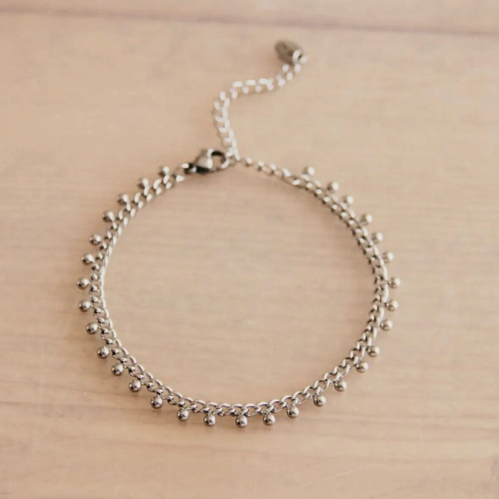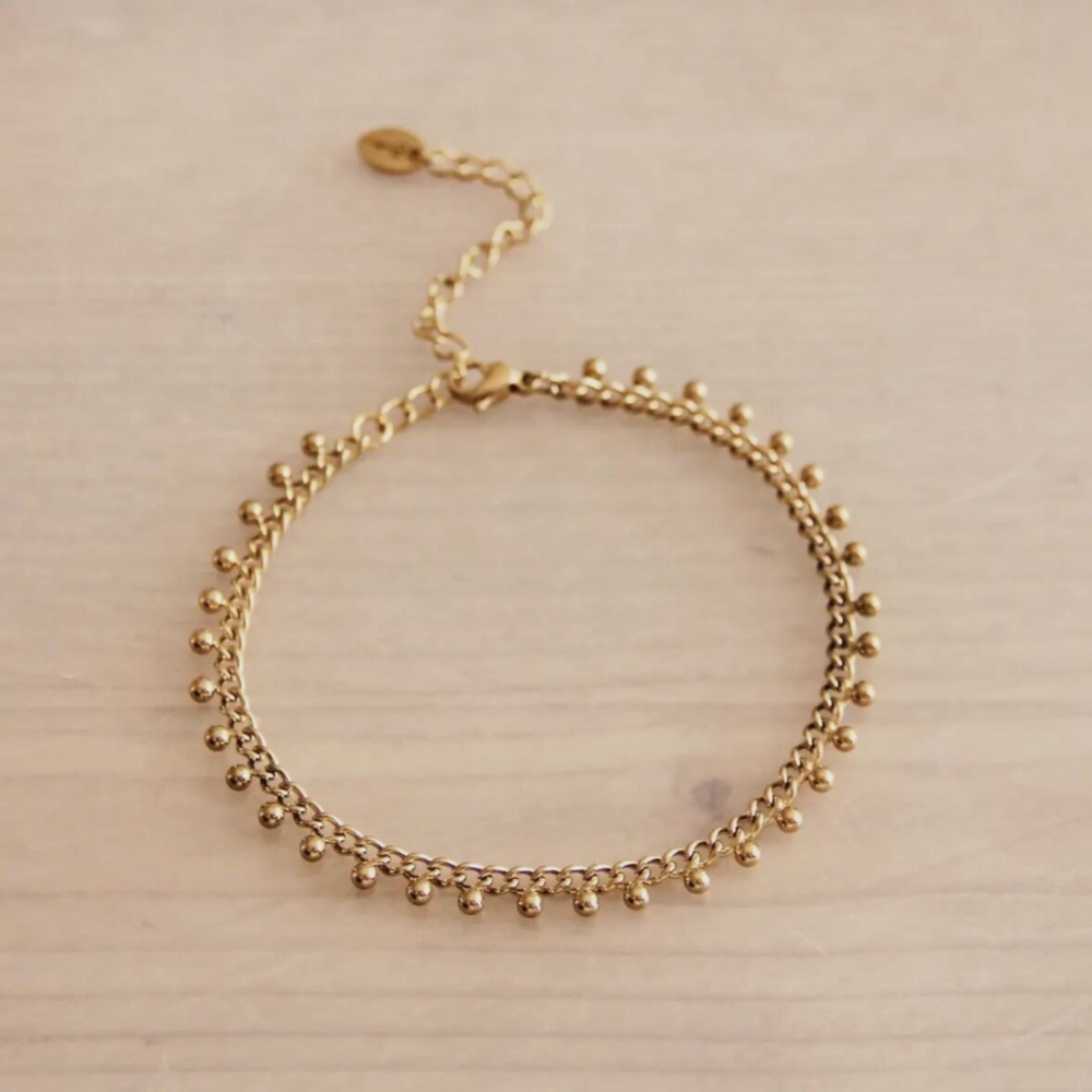 Stalen schakelarmband met balletjes in goud en zilver.