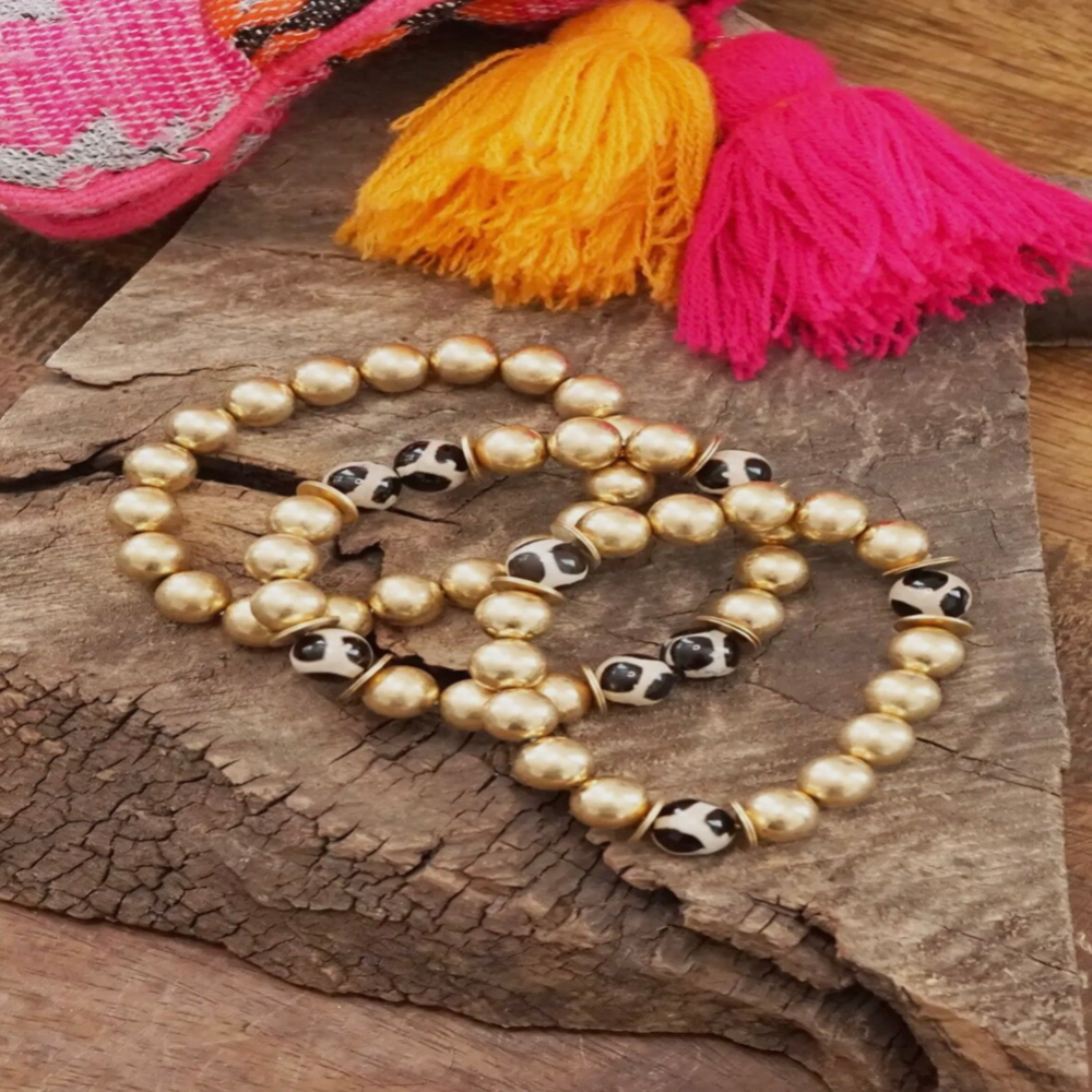 3 Gouden elastische Boho kralenarmbanden met keramische bea met dierenprint.