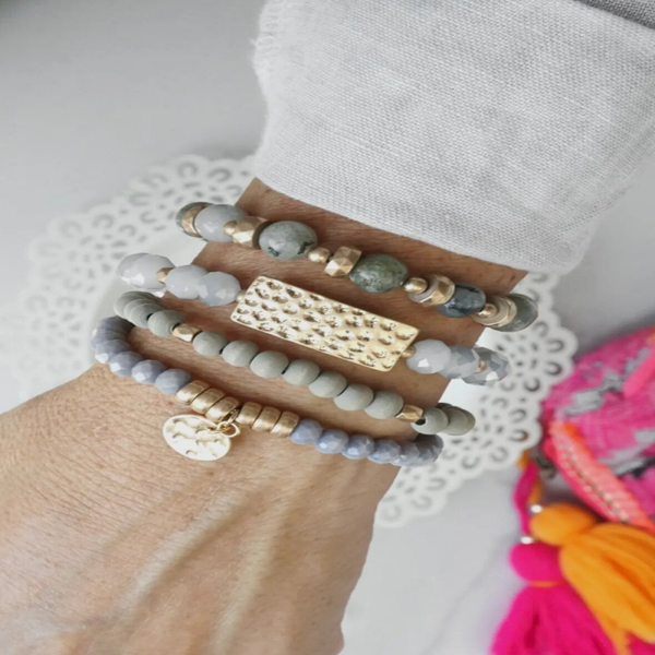 Set van 4 eleastische Boho Kralenarmbanden met grijs hout en halfedelstenen, glazen gouden munt en kralen.