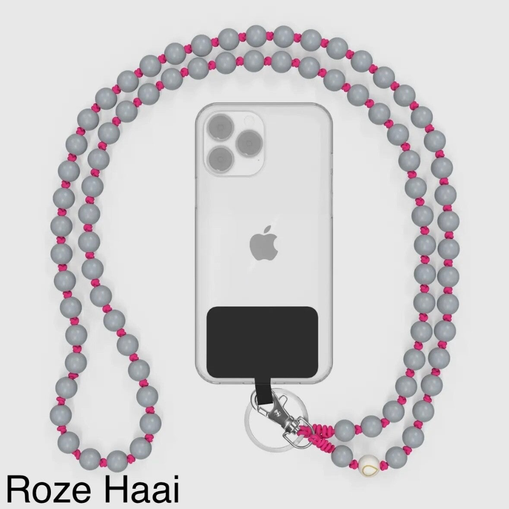 De Roze Haai telefoonketting combineert stoere tinten met een speels kleuraccent. De grijze kralen vormen een stijlvolle basis, terwijl het roze koord zorgt voor een frisse, opvallende touch. Perfect voor wie een subtiele maar unieke look zoekt.