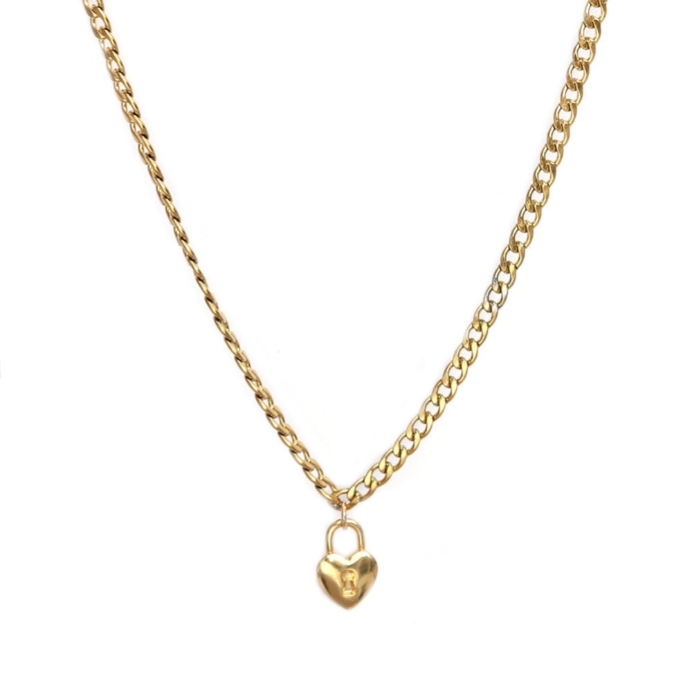 Gouden ketting van grove schakels met een slot bedeltje in de vorm van een hart.