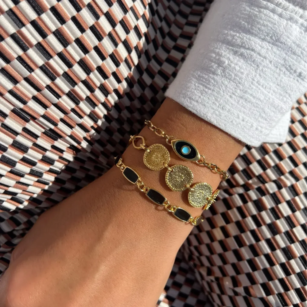 Armband in goudkleur van roestvrij staal met etnische schijven op een rij.